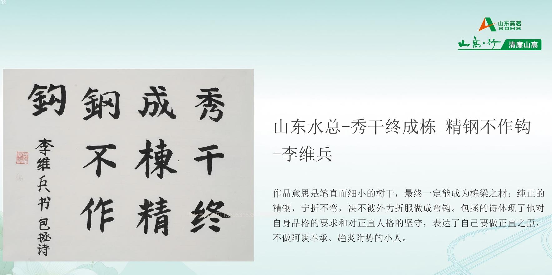 6月11日,在山东高速集团纪委组织的“清廉山高”廉洁文化作品征集活动中,山东水总基础工程有限乐动在线登录制作的短视频《筑廉洁防线,守初心之路》荣获“光影映廉”板块三等奖,第二分乐动在线登录李维兵的书法作品《秀干终成栋,精钢不作钩》摘得“工艺创廉”书法类优秀奖。